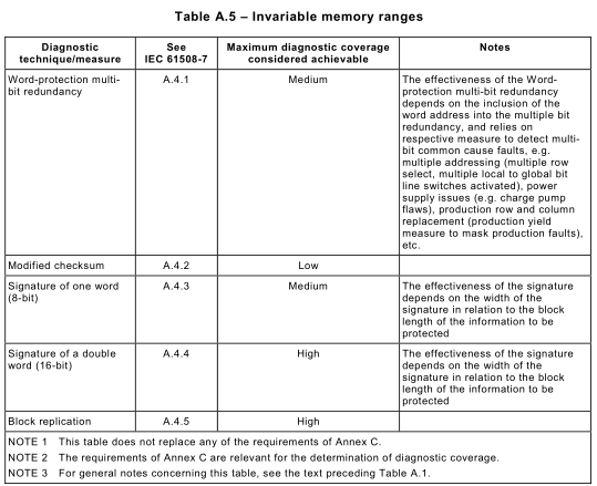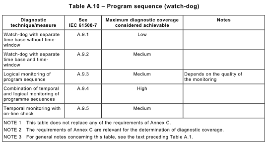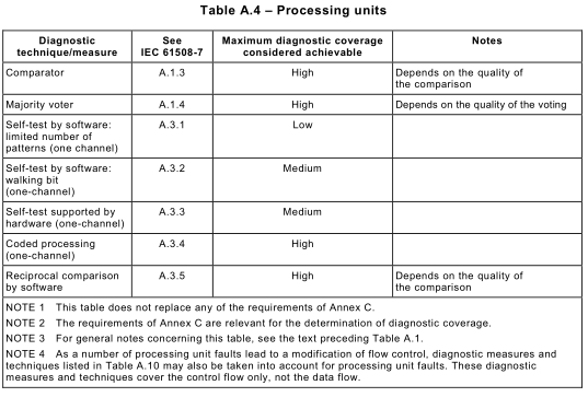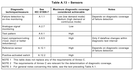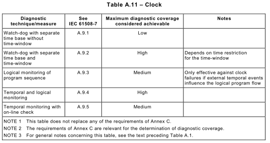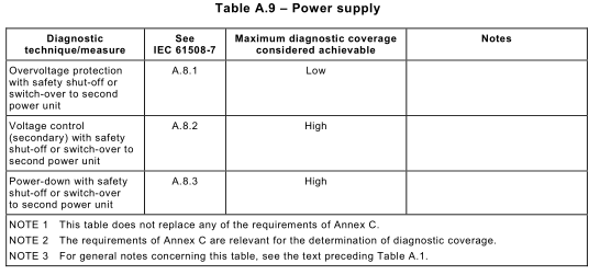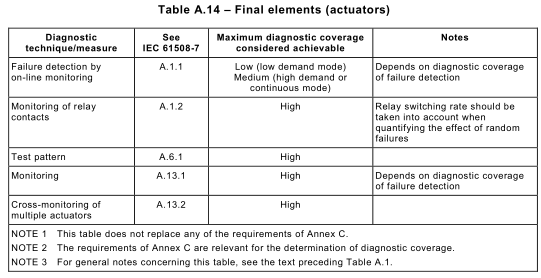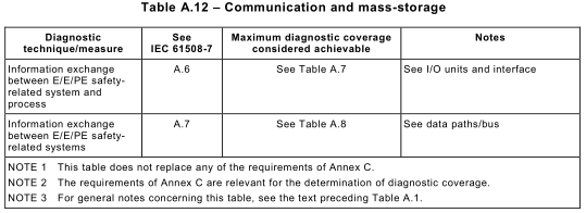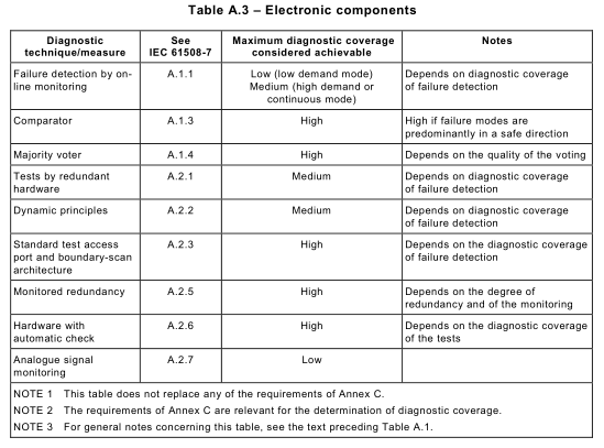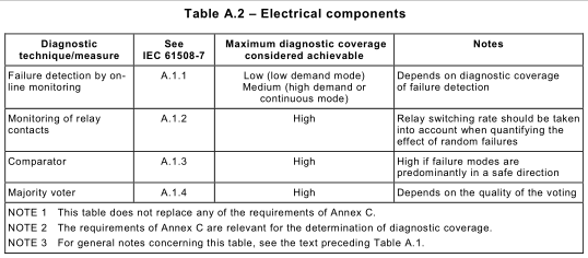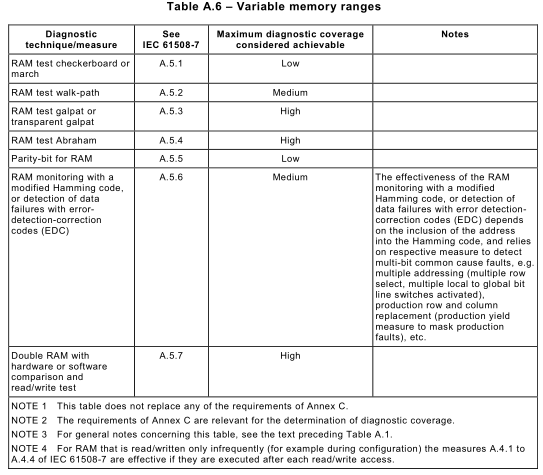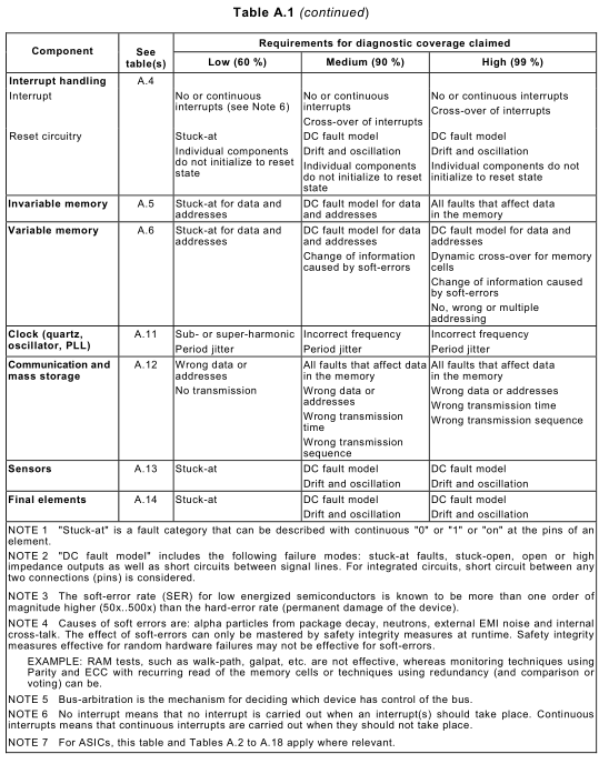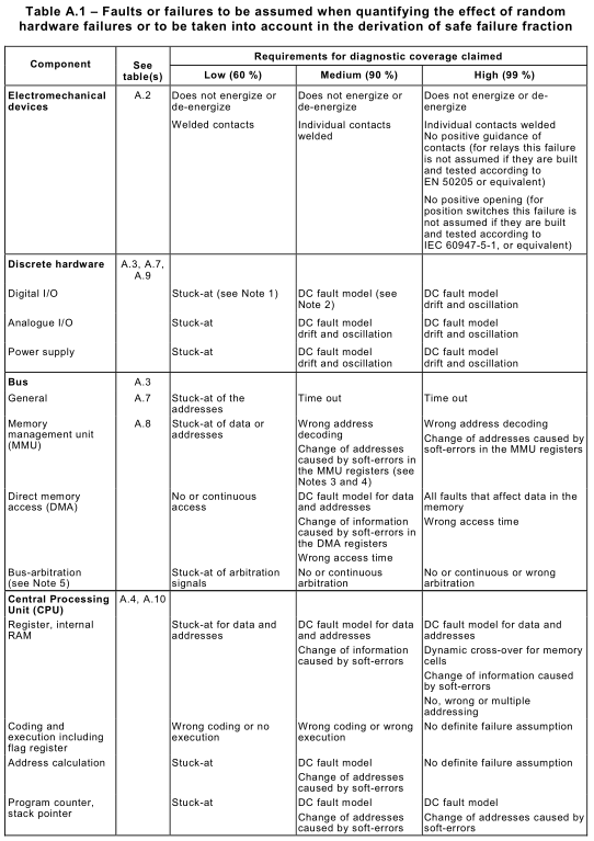 Annex A A.1General It is not possible to list every individual physical cause of a failure in complex hardware for two main reasons: In order to avoid or control such failures when they occur, a large number of measures are normally necessary. The structure of the requirements in Annexes A and B results from dividing the measures into those used to avoid failures during the different phases of the E/E/PE system safety lifecycle (Annex B), and those used to control failures during operation (this Annex). The measures to control failures are built-in features of the E/E/PE safety-related systems. Diagnostic coverage and safe failure fraction are determined on the basis of Table A.1and according to procedures detailed in Annex C. Tables A.2 to A.14 support the requirements of Table A.1by recommending techniques and measures for diagnostic tests and recommending maximum levels of diagnostic coverage that can be achieved using them. The tables do not replace any of the requirements of Annex C. Tables A.2 to A.14 are not exhaustive. Other measures and techniques may be used, provided evidence is produced to support the claimed diagnostic coverage. If high diagnostic coverage is being claimed then, as a minimum, at least one technique of high diagnostic coverage should be applied from each of these tables. Similarly, Tables A.15 to A.17 recommends techniques and measures for each safety integrity level for controlling systematic failures. Table A.15 recommends overall measures to control systematic failures (see also IEC 61 508-3), Table A.16 recommends measures to control environmental failures and Table A.17 recommends measures to control operational failures. Most of these control measures can be graded according to Table A.18. All techniques and measures in these tables are described in Annex A of IEC 61 508-7. Software techniques and measures required for each safety integrity level are given in IEC 61 508-3. Guidelines for determining the architecture for an E/E/PE safety-related system are given in Annex B of IEC 61 508-6. Following the guidelines in this annex does not guarantee by itself the required safety integrity. It is important to consider the following: A.2 Hardware safety integrity Table A.1provides the requirements for faults or failures that shall be detected by techniques and measures to control hardware failures, in order to achieve the relevant level of diagnostic coverage (see also Annex C). Tables A.2 to A.14 support the requirements of Table A.1by recommending techniques and measures for diagnostic tests and recommending maximum levels of diagnostic coverage that can be achieved using them. These tests may operate continuously or periodically. The tables do not replace any of the requirements of 7.4. Tables A.2 to A.14 are not exhaustive. Other measures and techniques may be used, provided evidence is produced to support the claimed diagnostic coverage. NOTE 1 The overview of techniques and measures associated with these tables is in Annex A of IEC 61 508-7. The relevant subclause is referenced in the second column of Tables A.2 to A.14. NOTE 2 The designations low, medium and high diagnostic coverage are quantified as 60 %, 90 % and 99 % respectively.