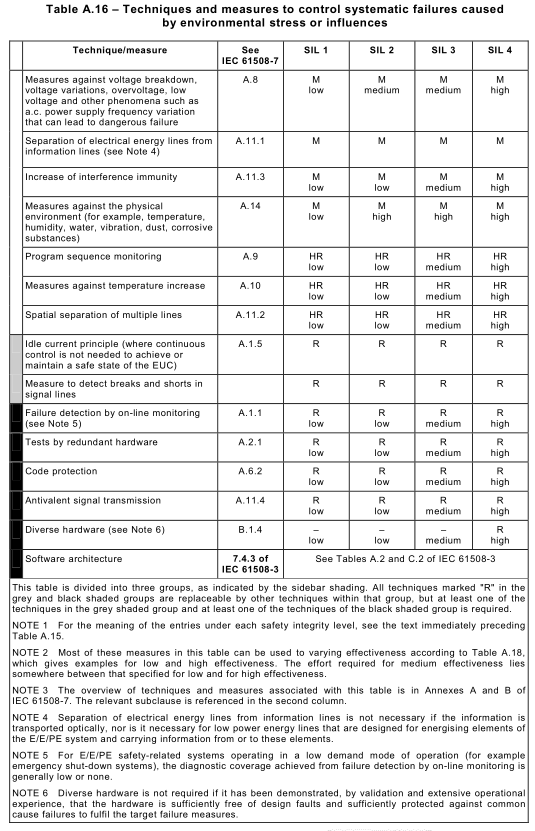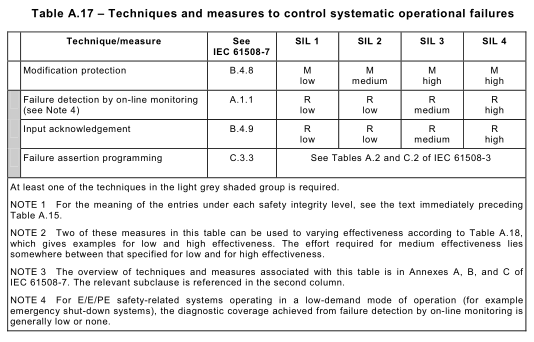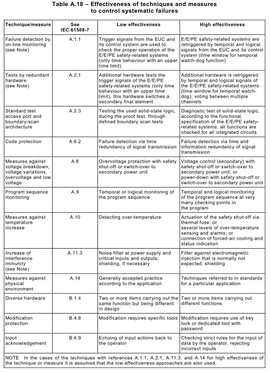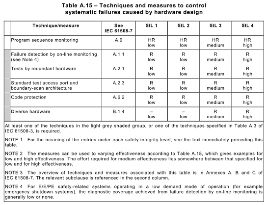 – R: the technique or measure is recommended for this safety integrity level; Guidance on levels of effectiveness for most techniques and measures is given in Table A.18. If a measure is not mandatory, it is in principle replaceable by other measures (either All techniques and measures given here are built-in features of the E/E/PE safety-related systems, which may help to control failures on-line. Procedural and organisational techniques and measures are necessary throughout the E/E/PE system safety lifecycle to avoid introducing faults, and validation techniques to test the E/E/PE safety-related systems’ behaviour against expected external influences are necessary to demonstrate that the built-in features are appropriate for the specific application (see Annex B). Annex D of IEC 61 508-6 gives information on common cause failures. NOTE Most of the measures in Tables A.15 to A.17 can be used with varying effectiveness according to Table A.18, which gives examples for low and high effectiveness. The effort required for medium effectiveness lies somewhere between that specified for low and high effectiveness.