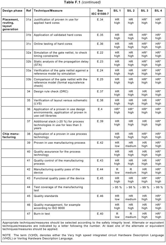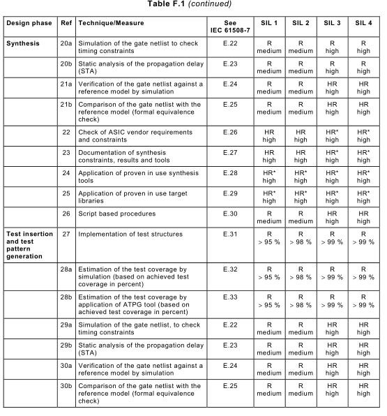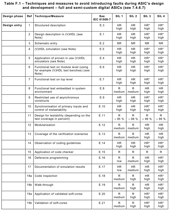 Annex F NOTE 1 This informative annex is referenced by 7.4.6.7. NOTE 2 The following techniques and measures are related to digital ASICs and user programmable ICs only. For mixed-mode and analogue ASICs no general techniques and measures can be given at the moment. a) All design activities and test arrangements, and tools used for the functional simulation and the results of the simulation, should be documented. b) All tools, libraries and manufacturing procedures should be proven in use. This includes: NOTE 3 A substantial period of time might be 2 years in this case. NOTE 4 User training is very important because of the rapid changes and progress in this field. c) All activities and their results should be verified, for example by simulation, equivalence checks, timing analysis or checking the technology constraints. d) Measures for the reproducibility and automation of the design implementation process (script based, automated work and design implementation flow) should be used. e) For 3rd party soft-cores and hard-cores, only validated macro blocks should be used and these should comply with all constraints and proceedings defined by the macro core provider if practicable. Unless already proven in use, each macro block should be treated as newly written code, for example it should be fully validated. f) For the design, a problem-oriented and abstract high-level design methodology and design description language should be used. NOTE 5 The design description should use a hardware description language like VHDL or Verilog. This is the most common hardware description methodology used today in ASIC design. Both languages are defined by IEEE standards and are assumed to satisfy the recommendations for high level programming languages. The hardware g) Adequate testability (for manufacturing test of the full and semi-custom ASIC) should be achieved. h) Gate and interconnection (wire) delays should be considered during test and ASIC i) Internal gates with tristate outputs should be avoided. If internal tristate outputs are used these outputs should be equipped with pull-ups/downs or bus-holders. j) Before manufacturing, an adequate verification of the complete ASIC (i.e., including each verification step carried out during design and implementation to ensure correct module and chip functionality) should be carried out. NOTE 6 The adequacy of ASIC verification depends on the test complexity of the element and the required safety integrity level. F.2 Guidelines: Techniques and measures – HR*: the technique or measure is highly recommended for this safety integrity level. No design should exclude this technique or measure; – HR: the technique or measure is highly recommended for this safety integrity level. If this technique or measure is not used, then the rationale behind not using it should be detailed; – R: the technique or measure is recommended for this safety integrity level. If this – -: the technique or measure has no recommendation for or against being used; If this technique or measure is used, then the rationale behind using it should be detailed;